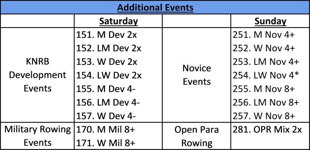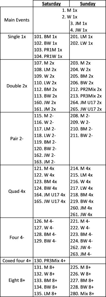 The U23 events (“B”) will be merged with the open events if less than 4 crews enter.